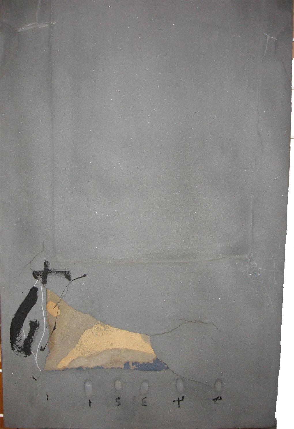 in exchange. Tàpies suggested it be restored and donated in Stadler’s name to the Collection of the Fundació Antoni Tàpies, which had just been created. During the restoration in 1990, the artist decided not to conceal the loss of materials, allowing us to appreciate the different layers in the work, while he added a black graphic mark and numbers, inverted as if reflected in a mirror.